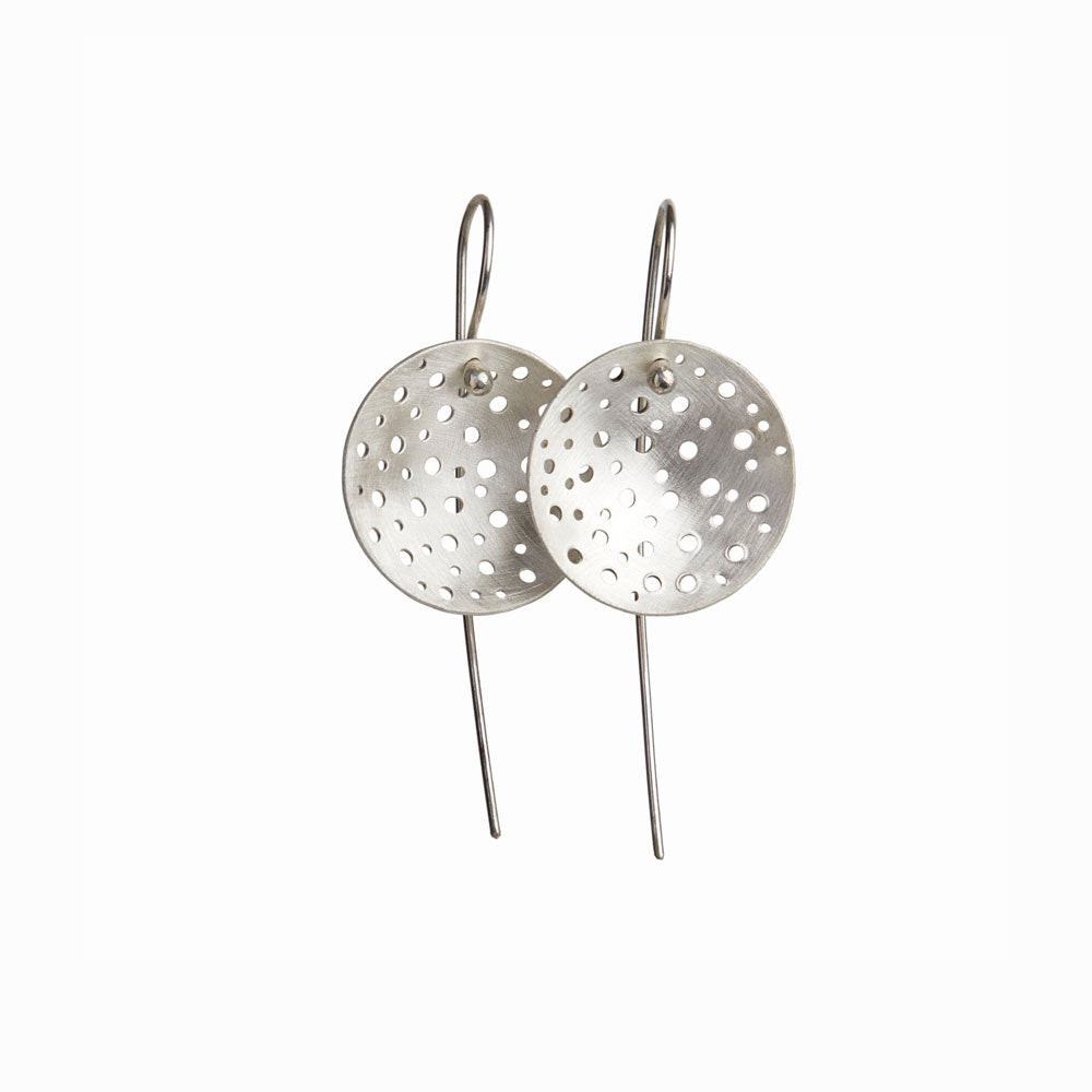 Deeper than the Grand Canyon, and visible to the naked eye, Aristarchus is the moon's most brilliant crater. It's the inspiration for our Aristarchus Earrings. A pair of concave silver medallions, hand-brushed to a luminous, satin finish. Punctuations of craters add depth and interest. Like its namesake, when in light, comes a resplendent dazzle. The thin, effortless-to-wear ear hooks complete the weightless effect. Caution: you may need sunglasses to stare into these wearable works of art. Proudly handcrafted and detailed by Elke out of .925 silver in NYC.