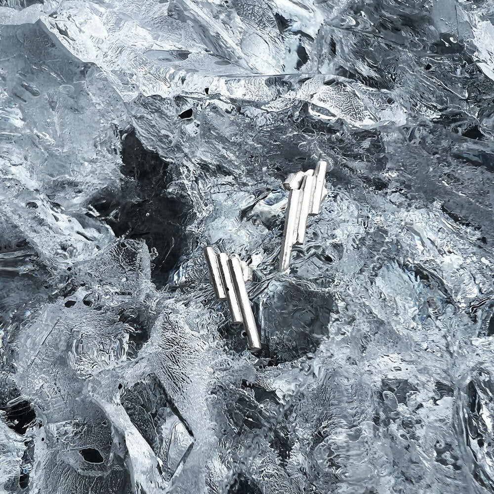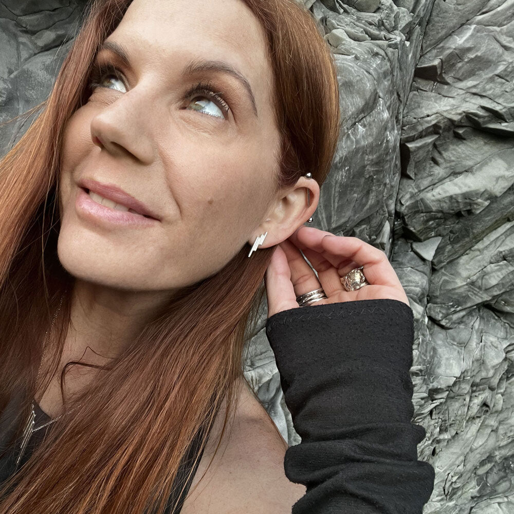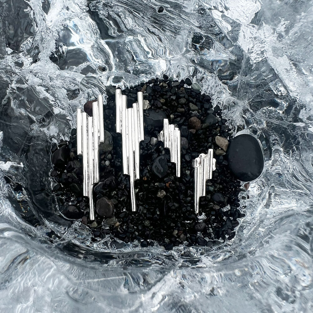 The Basalt Stud Earrings were born from Elke's travels to Iceland's Vik Beach, where dramatic rock columns emerge from black sand beaches. Sterling silver towers form a seductive, shimmering stairway, leading light and eyes in your direction. Who says delicate scales can't make bold statements? Handcrafted in NYC.