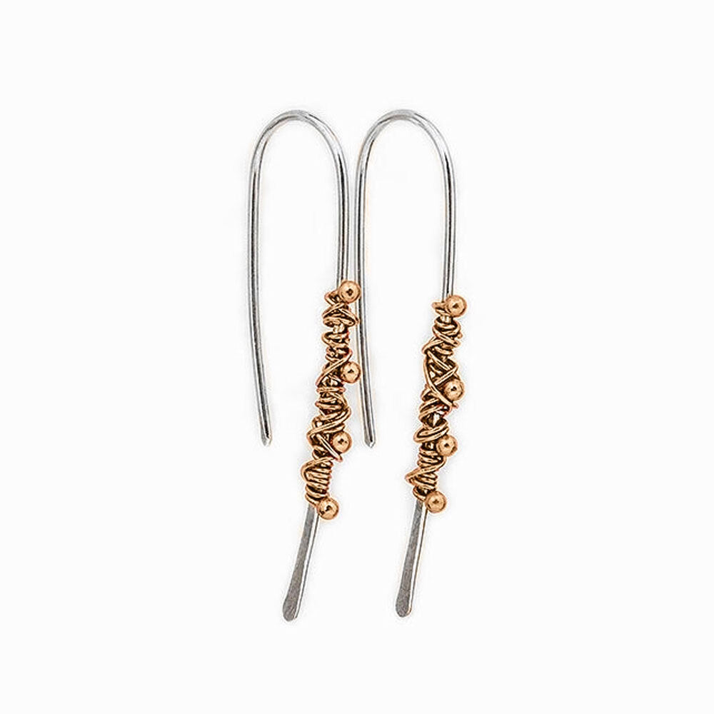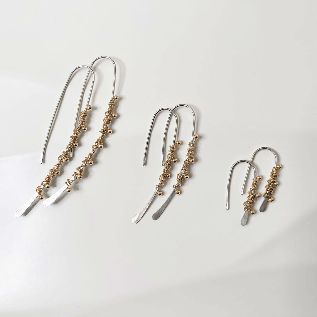 Glimmering gold dewdrop studs wrapped in the seductive curves of a teardrop base. The contrasting shapes in highly polished sterling silver play with light, recalling morning rain on branches. Our Gold Dewdrop Threader Earrings have a poetic, minimal charm that will never make you cry. Proudly handmade by Elke in NYC.