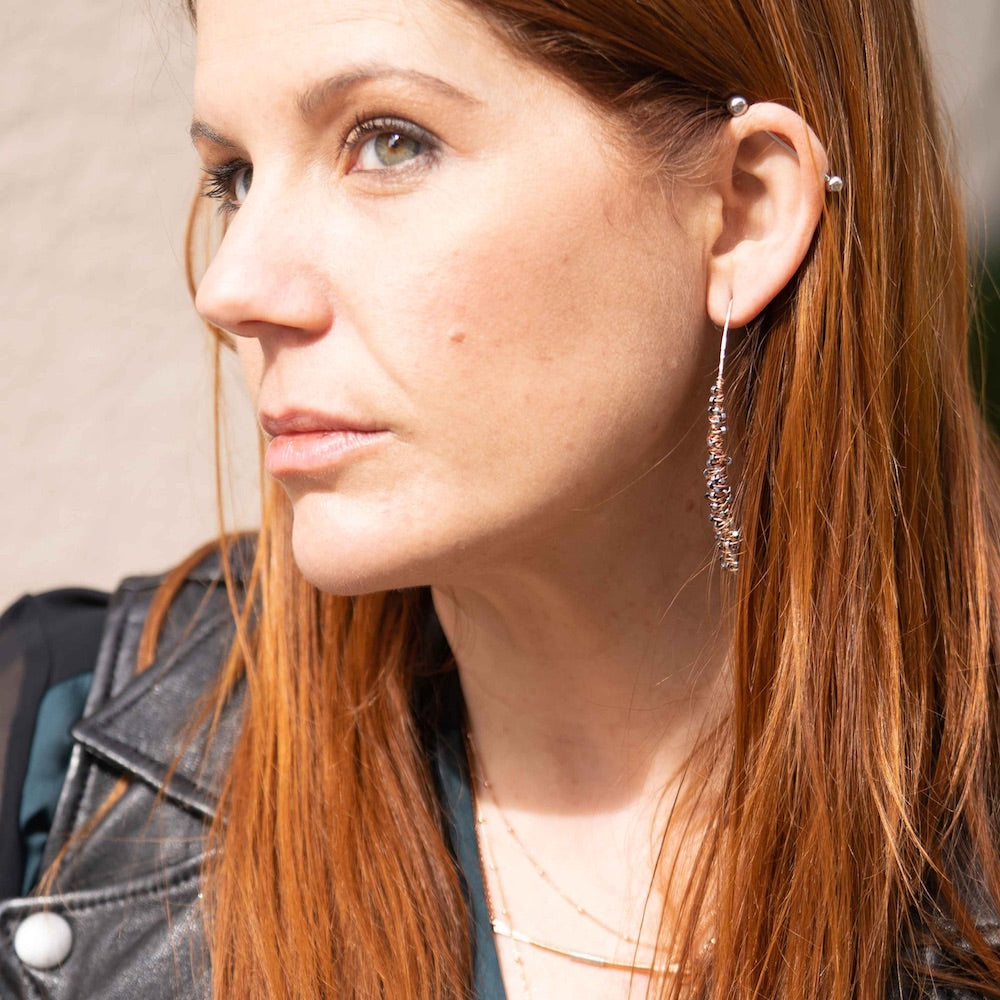 Tight curls of rose golden threads envelope the inviting arch of our wishbone base. Interlaced with hints of hematite gems, it creates a subtle geometric counterpoint to all the flowing, sensual curves. With equal measures of mystery and manifestation, our Cocoon Earrings will transform your style. Handcrafted in NYC.
