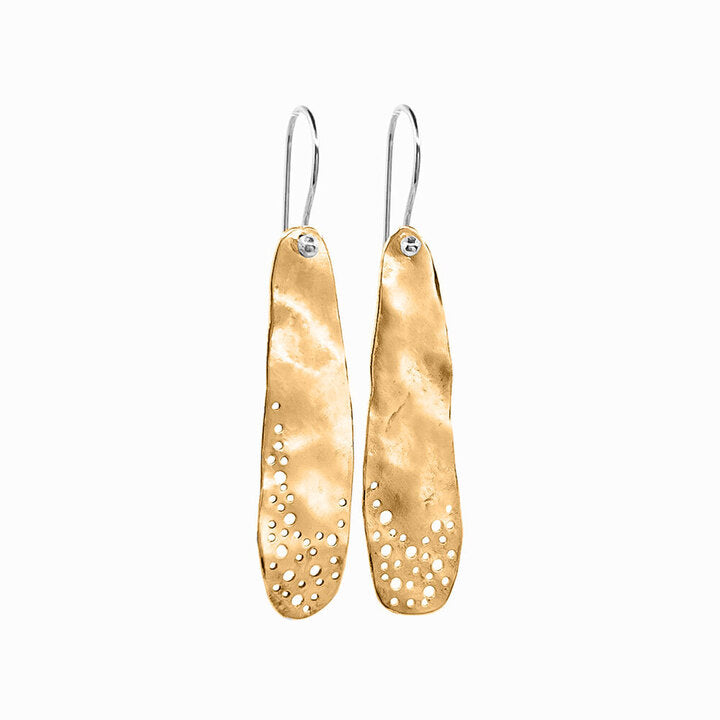 Like droplets of golden moonlight punctuated with stars, our Gold Moon Dust Drop Earrings feature lustrously hand-polished 14K gold over sterling silver and a delicate curve of perforations, adding further depth, light, and interest. The thin, effortless-to-wear ear hooks complete the weightless effect. Proudly handcrafted and detailed by Elke in NYC.