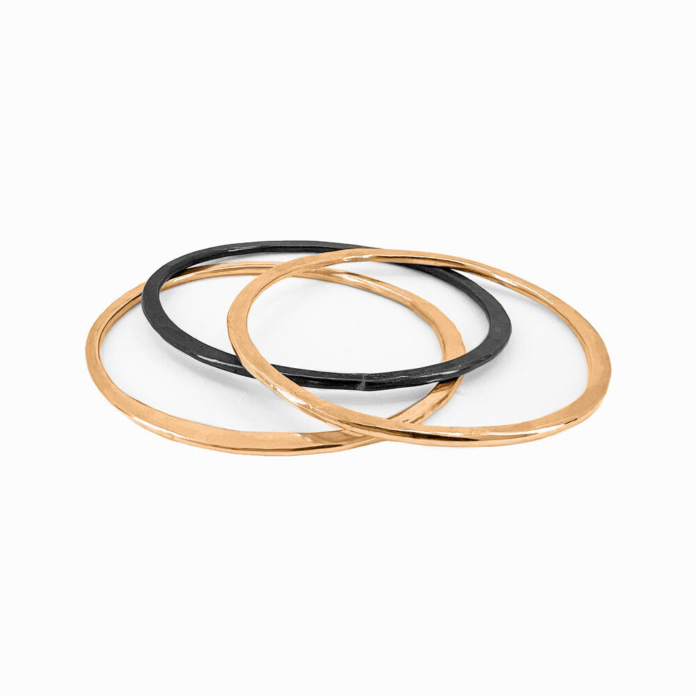 Imperfect perfection defines this staple of our Orbit Collection. Evoking the elliptical planetary paths that may guide our futures, the Orbit Bangle Bracelet is understated, vibrant, and destined to be the hardest-working and most modularly minimalist piece in your lineup. Starting with an organic round of solid 14k gold fill, Elke adds depth and dimension to the shimmering finish with strikes of her hammer. Available in sets of three or individually, it’s made to be combined and layered with other versions in the series.