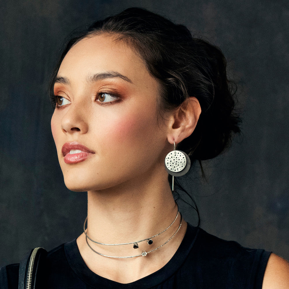 Shadow and light. Sun and moon. Bold and understated. Our Eclipse collection captures the yin-yang of opposites in balance. Our Eclipse Earrings have a gravity that pulls you in. A luminous, silver moon contrasts with a moody, oxidized crescent, replete with moonscape textures and punctuations of craters adding depth and interest. The thin, effortless-to-wear ear hooks complete the weightless effect. Proudly crafted and detailed by Elke out of .925 silver in NYC.