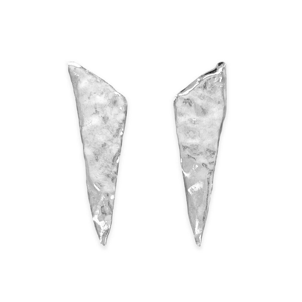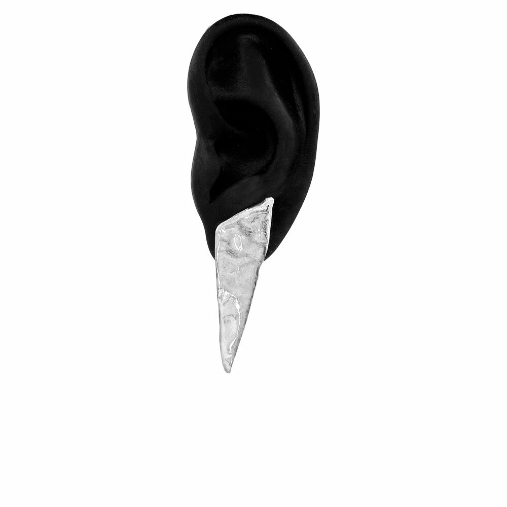 Traveling through Rejkavik, Elke was fascinated by the icy textures and silent majesty of epic glaciers drifting in deep, cold waters. Her Glacier Triangle Earrings are silvery, glimmering daggers that cut deep with an artic, edgy minimalism. Its rugged, organic surfaces will command attention and light.It doesn’t get much cooler than this. The long version is for added scale and drama, while the short serves a more delicate, subtle approach. Proudly handmade out of .925 sterling silver in NYC.