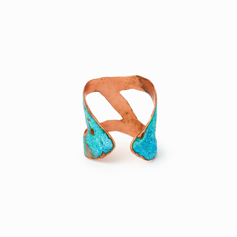 As bold as the river of its namesake, our Rio ring carves a deep turquoise path across contrasting banks of sun-drenched copper. Its asymmetric design allows it to be worn in many different configurations as it wraps itself dramatically around your finger. Its singularly deep, complex blue patina is the result of a four-day process of speckled layering and high-polished detailing, preserved with a layer of lacquer. Proudly hand-made in NYC and signed by Elke.