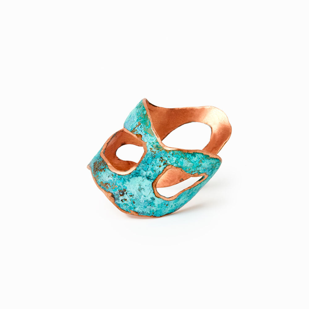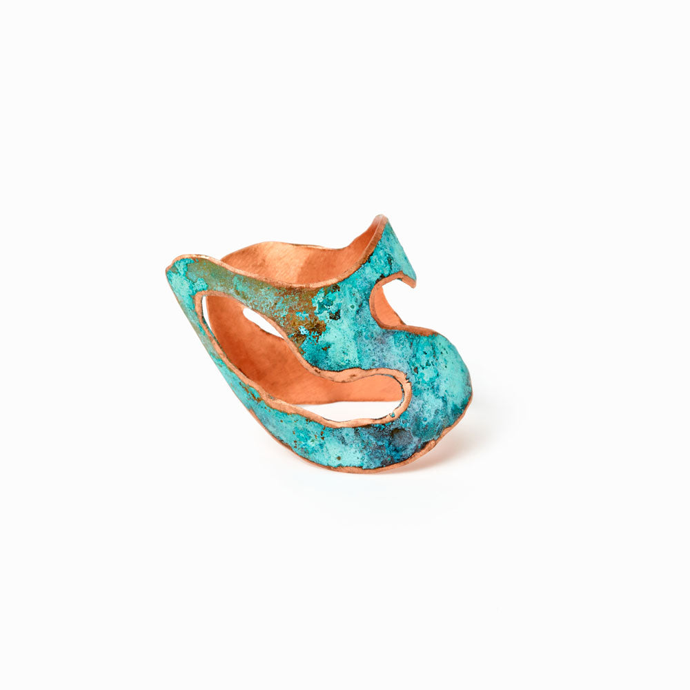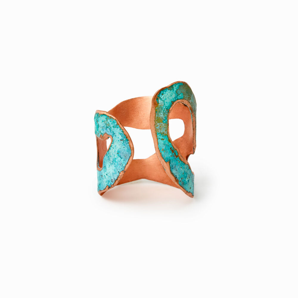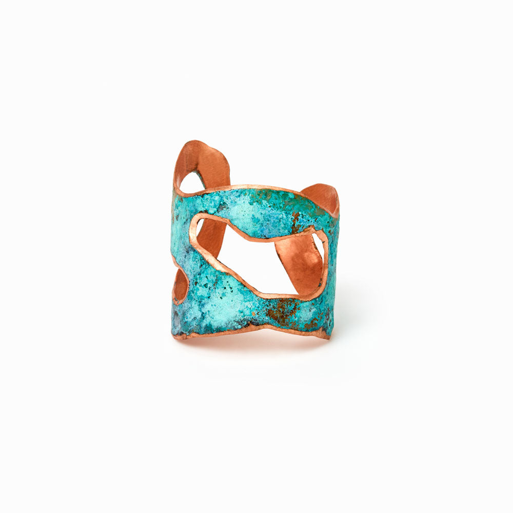 Hidden on the outskirts of Paris is a water-edged oasis known as the Lac de Minimes, which inspired this bold statement piece, a daring combination of polished minimalism and colorific complexity. It takes Elke nearly four days to achieve these untold depths of a turquoise blue patina. Using negative space to create islands of organic shapes further evokes the ring's namesake. Our Minimes Cuff Bracelet is finished with high-polish detailing and lacquered to preserve its vibrant palette. Every piece will have slight variations to make it uniquely yours. Proudly handmade in NYC and signed by the artist.