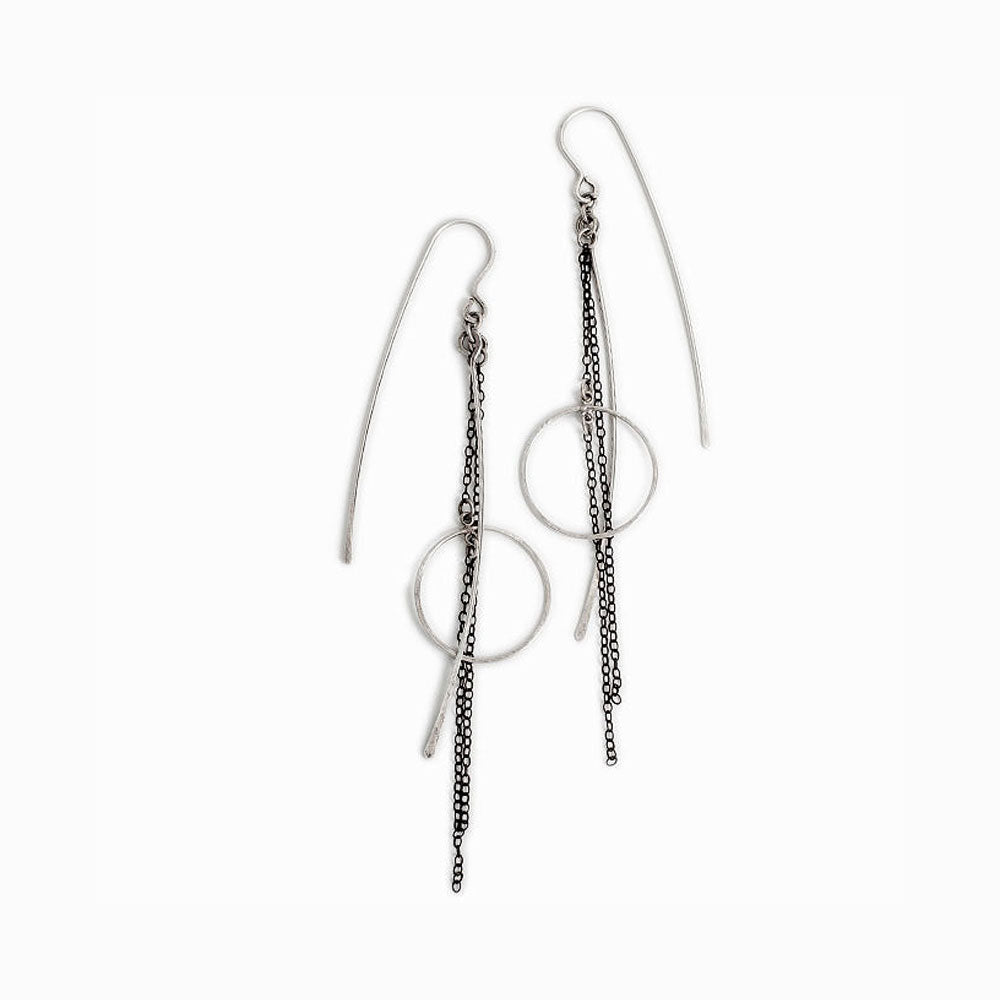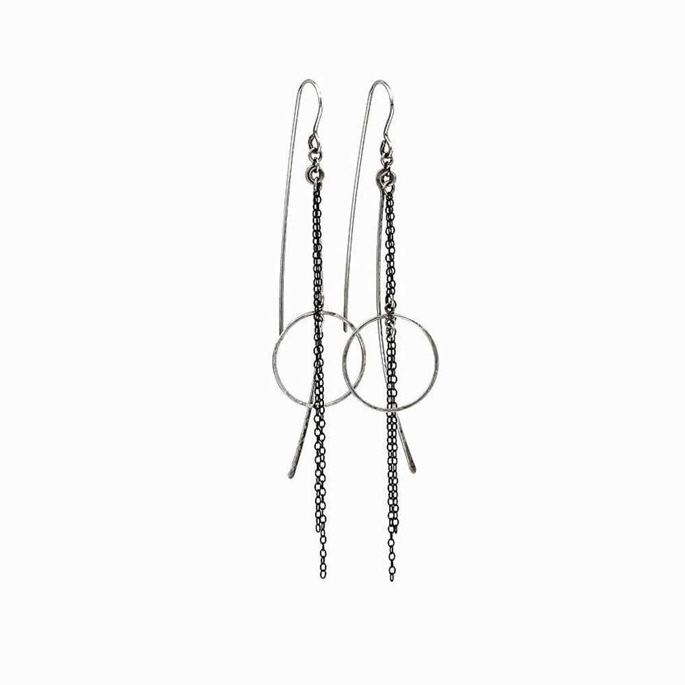 A full moon’s light dances on the water’s surface. Elke composes lunar poetry in the language of sterling silver hoops contrasted with lithe, oxidized chains. Whether wild nights or elegant evenings, our Moonlight Waterfall Earrings bring movement, allure, and just a tinge of goth to the proceedings. Proudly handmade by Elke in NYC out of solid .925 silver. Custom lengths are available.