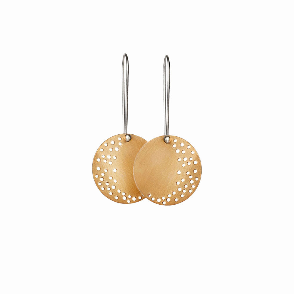 Luminal meets minimal in our Moon Dust Earrings. A pair of concave gold medallions, hand-brushed to a glowing satin finish, punctuated with a crescent of stars. Like a full moon reflecting the sun, expect resplendence when these earrings enter the light. The thin, effortless-to-wear earpins complete the weightless effect. Proudly handcrafted and detailed by Elke in NYC.