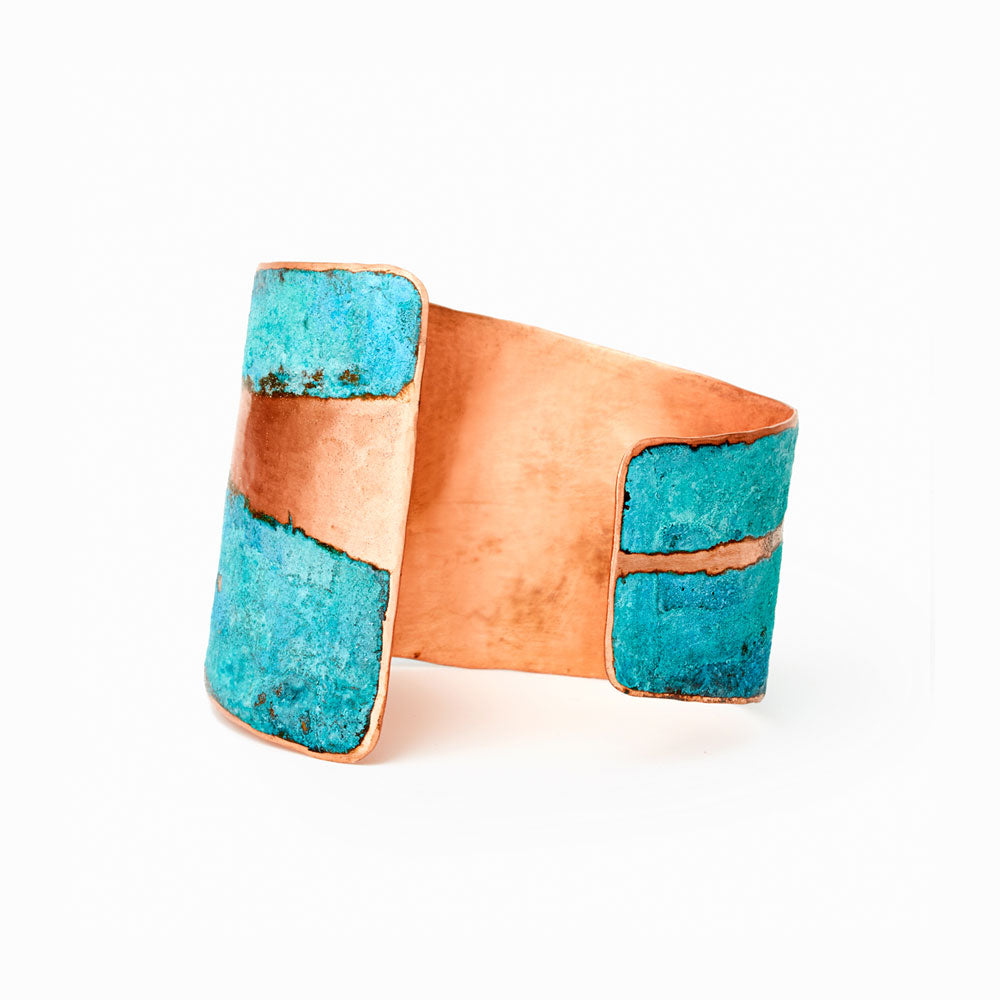 Elke spends days achieving the perfectly layered shores of turquoise patina, a perfect counterbalance to the warm tones of flame-treated copper. Lacquer preserves its vibrant colors, resulting in a show-stopping statement piece ready for anything, whether a night in the city or dancing on the sand. Proudly handmade in NYC, every Rio Cuff Bracelet has slight variations that will make it uniquely yours. Elke signs the inside of your one-of-a-kind wearable piece of art.