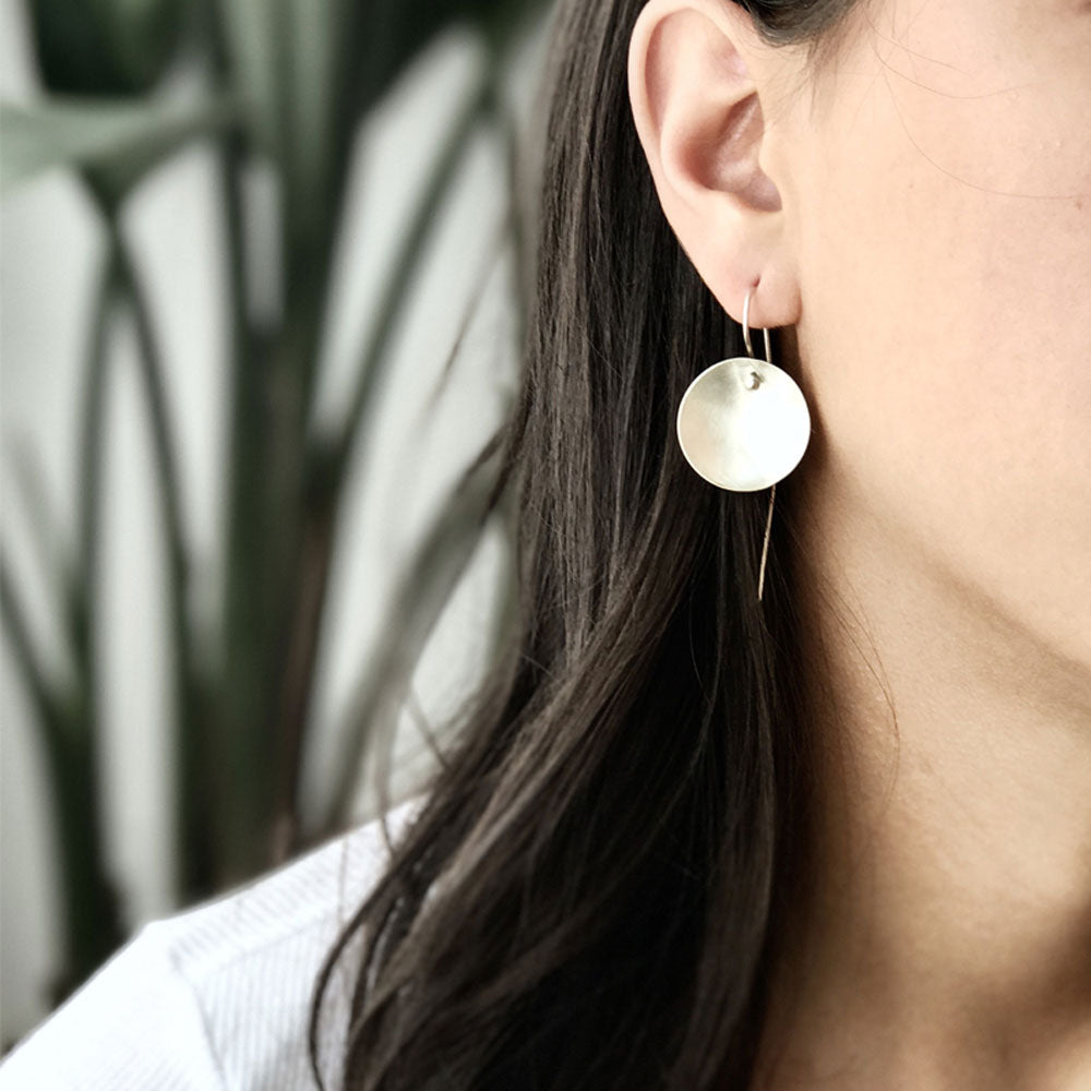 Land on our silver moon earrings for luminous minimalism that fits your every phase. A concave medallion of sterling silver in either soft satin or a brilliant high polish finish proves that simplicity can evoke complex emotions. It’s wearable art to influence and make waves. Proudly handmade by Elke in NYC.