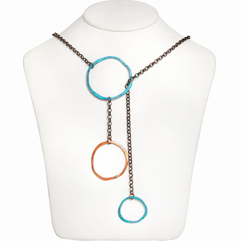 This trio of hand-formed halos of flame-torched copper and rich, patinaed turquoise copper is a balancing act full of plunging drama. The scale is both grand and minimal, making the most out of the play between positive and negative space. Unified with an oxidized rolo cable chain, our Trio Sea Cirque Lariat Necklace easily attaches in the front without the need for clasps. Proudly handmade in NYC, the piece is finished with lacquer to preserve its unique character.